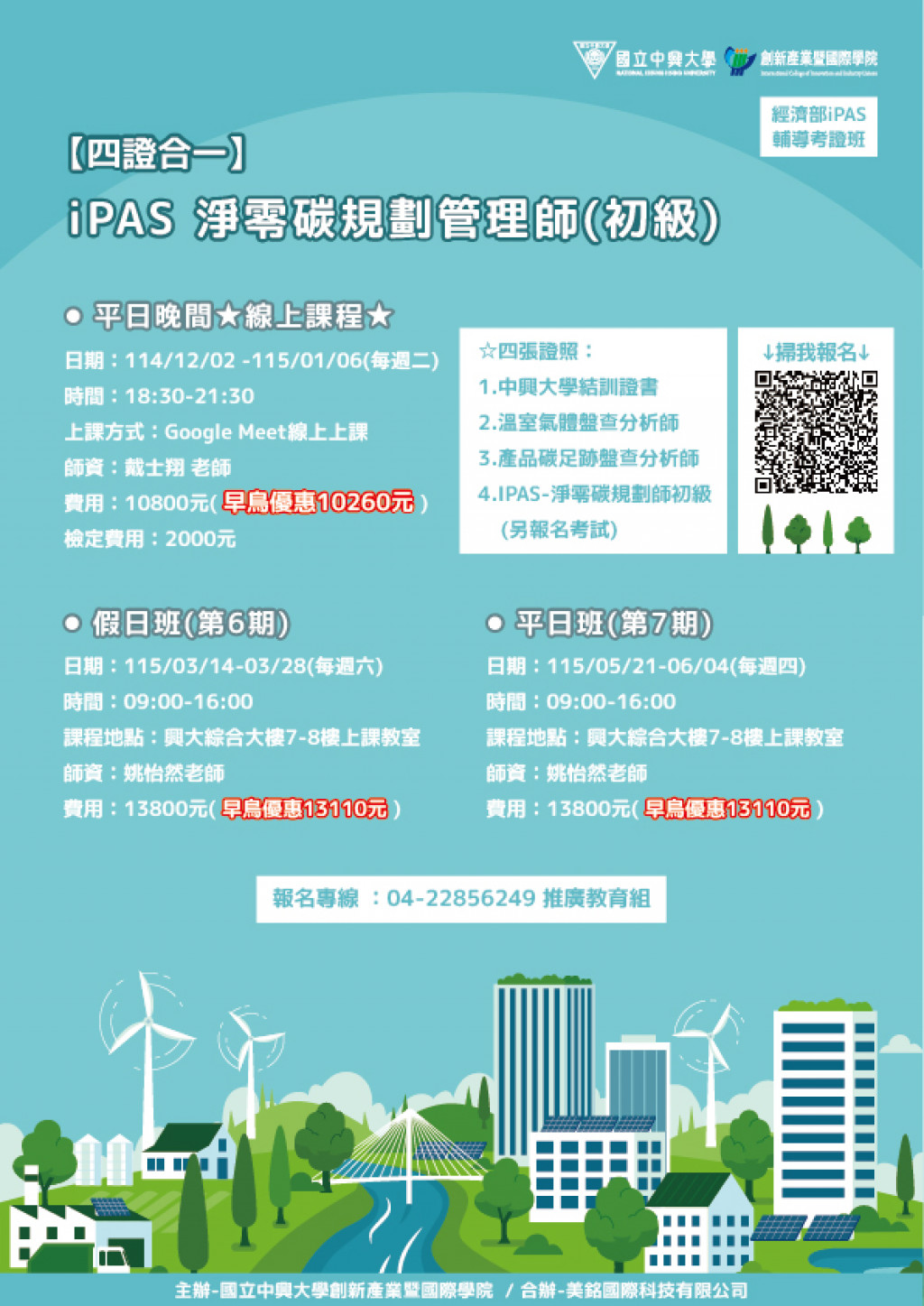 | 一、 | 課程目的:呼應國際趨勢及政府政策,充裕產業創新專業人才,培養符合企業升級轉型所需的「淨零碳排」與「AI 應用規劃」專業人才。 |