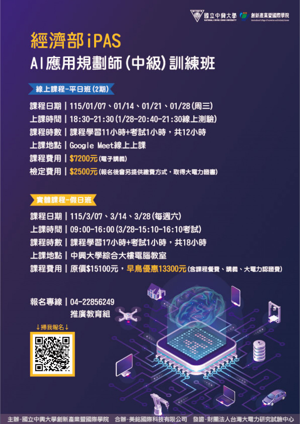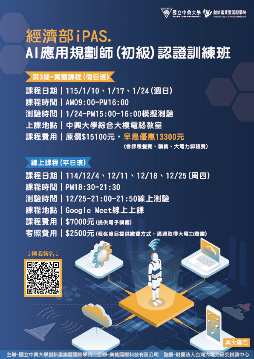 | 四、 | 報名方式:至「國立中興大學-創新產業暨國際學院線上報名繳費系統」,免費加入會員即可報名。 |