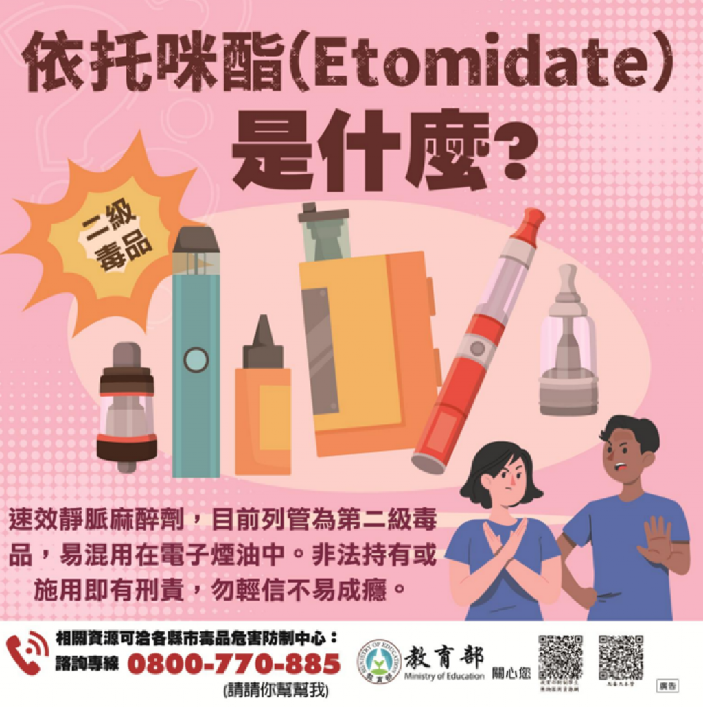 近年來,部分不法分子將依托咪酯(Etomidate)混入電子煙油中,以「助眠」、「放鬆」等名義誘騙年輕人使用。然而,依托咪酯是一種第二級毒品,屬於強效靜脈麻醉劑,非法持有或施用皆屬違法行為。
