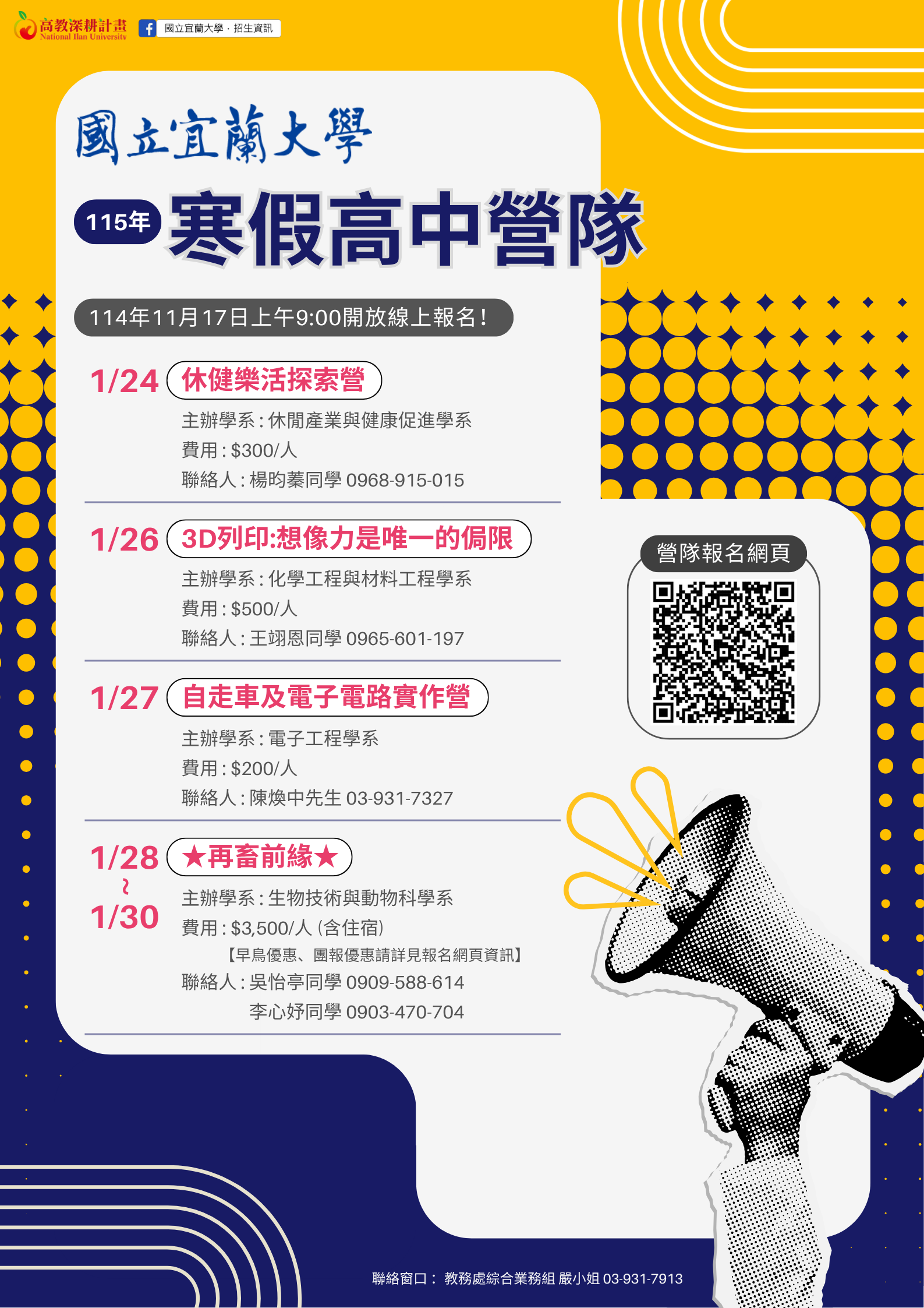 檢附活動海報乙份,完整訊息請至活動網站(網址:https://sites.google.com/ems.niu.edu.tw/115winter),或由國立宜蘭大學首頁(網址:https://www.niu.edu.tw)/招生資訊/在宜大夢想起飛/高中營隊查詢。