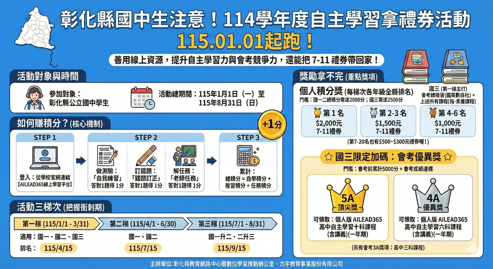 寒假不停學,持續學習 寒假即將到來,教務處已經為大家派發了各年段的ailead365「寒假線上作業」挑戰 (即日起至2/22晚上)。 這是複習,不是考試 不急著寫完,沒把握的題目,重新翻閱學習再來作答。 既可以累積實力,也可以爭取縣府線上學習禮卷喔! 60分以上的作業達成6張以上者,教務處於寒假結束後統計達成狀況給予嘉獎勳章。 ailead365二林高中專屬連結網址: http://elshchc.ailead365.com/