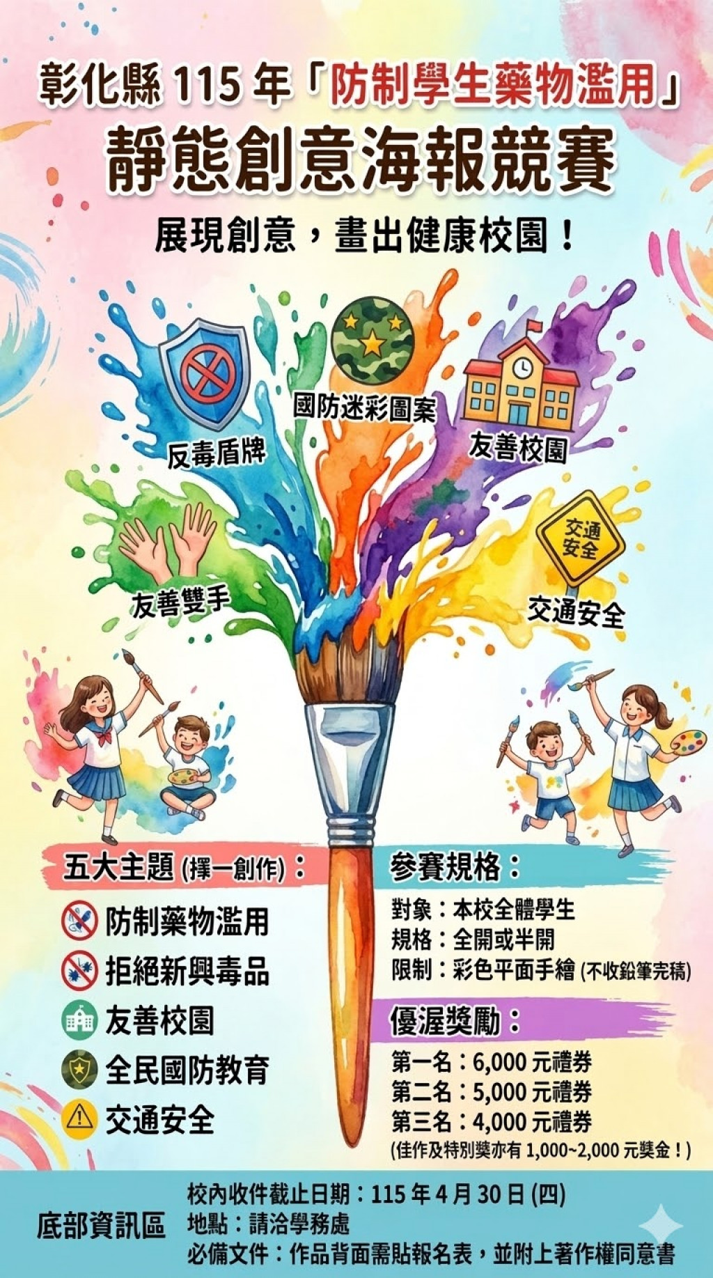 五、 截止日期: 請於 115年4月30日 (星期四) 前將作品送交至學務處 。